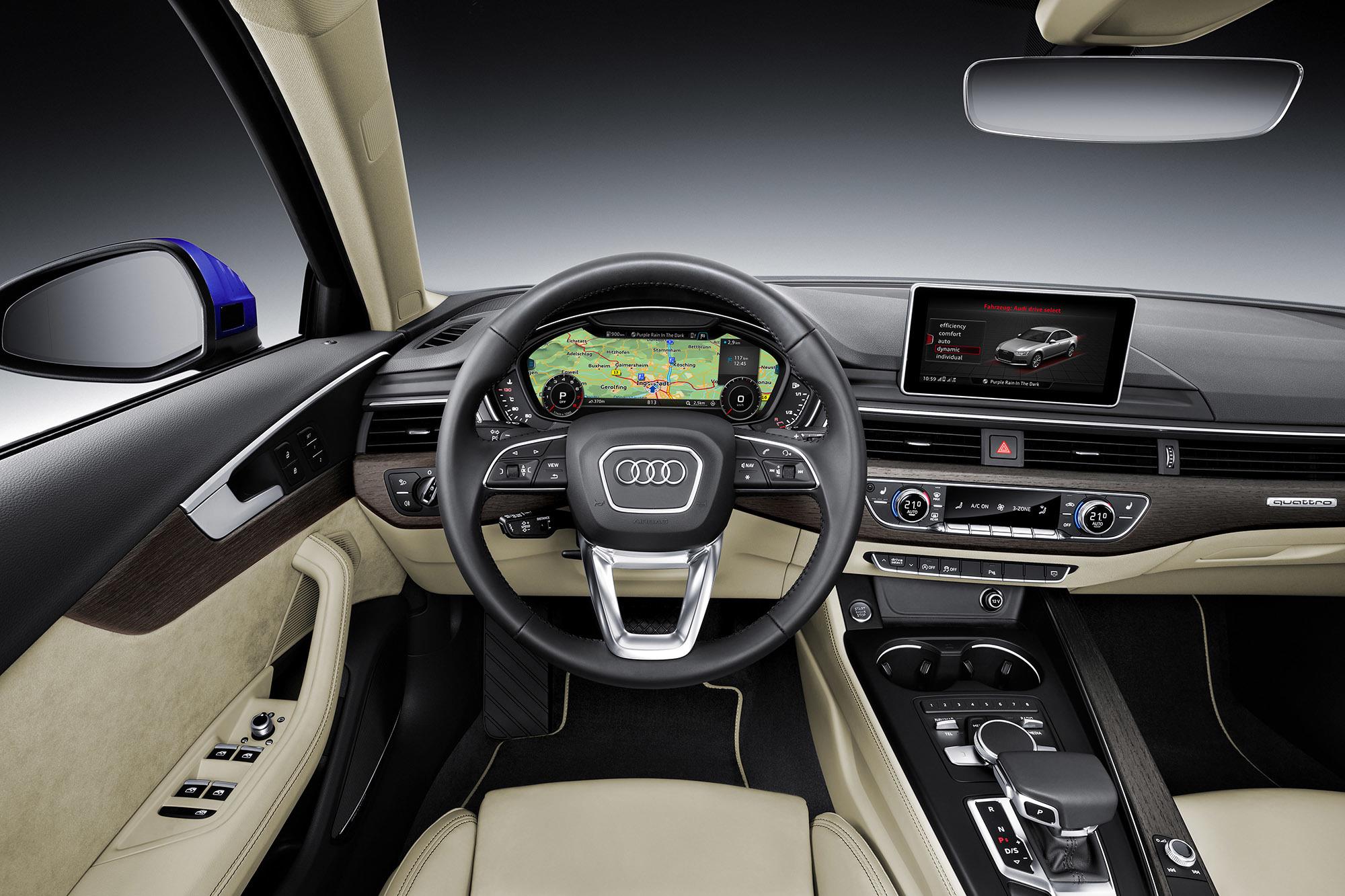 Resembling the classic design of an A4, the model features dynamic sharp lines that accentuate the familiar outer body design. While the exterior updates are minimal from its predecessor model, the A4 remains attractive from every angle. A sleek Audi standard grille sits prominently complimented by LED daytime running headlights as well as new fog lights adorning the rear bumper. Seeking a more aggressive stance? Try the Black Optic exterior package on for size. The upgrade features gloss black window trim, an exclusive grille, body-colored side mirrors, and 19-inch Titanium Rotor-design wheels. All proving that on the A4, black never looked so good.