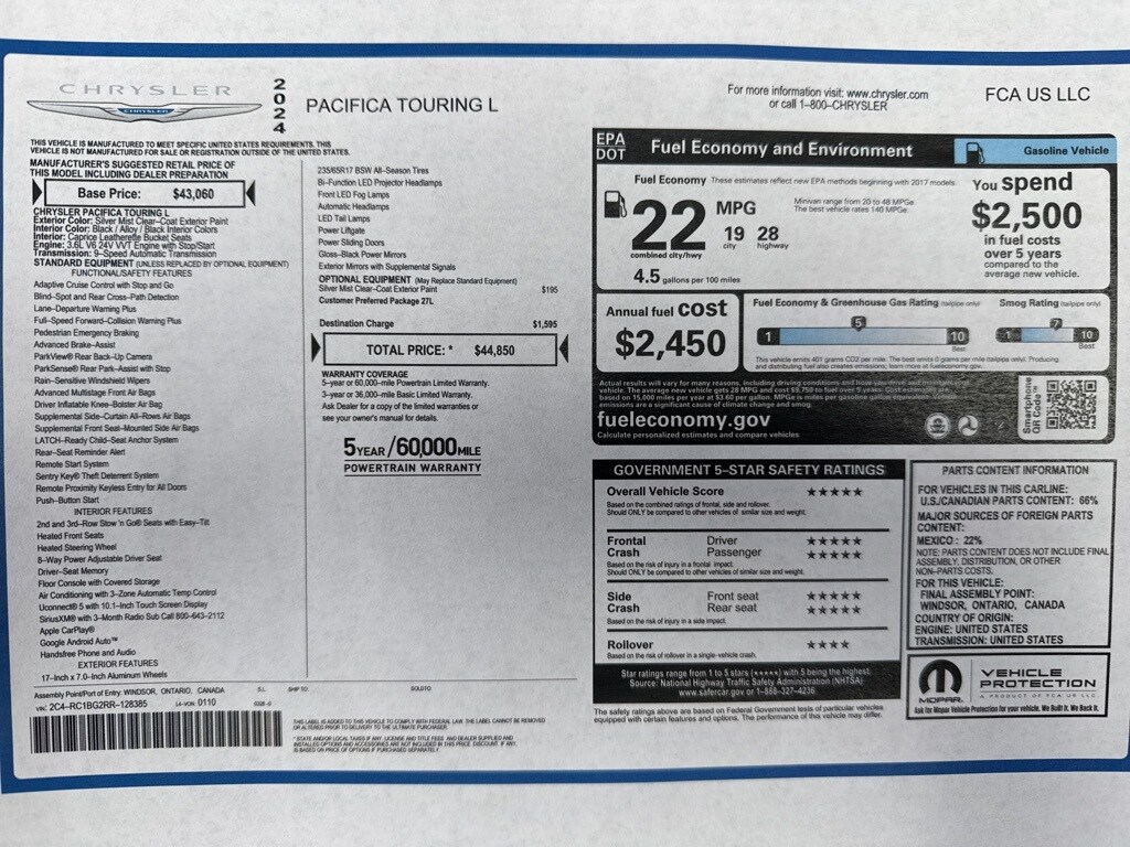 2024 Chrysler Pacifica Touring L Silver Mist Clearcoat FWD 3.6L V6 24V VVT