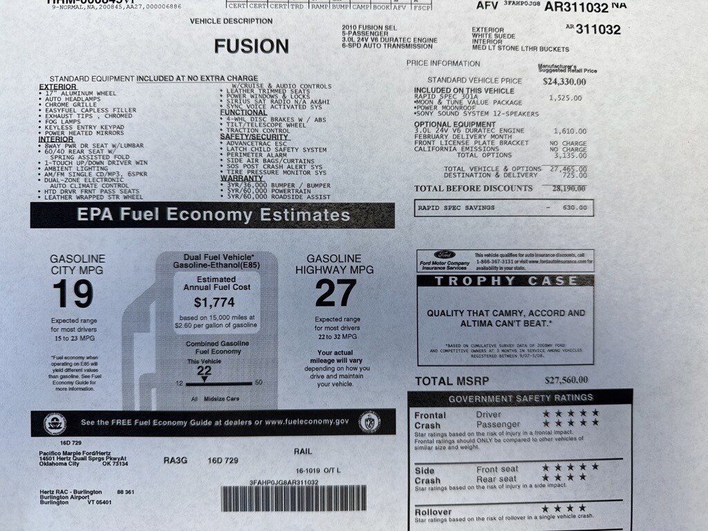 2010 Ford Fusion SEL White Suede FWD 3.0L V6 Flex Fuel