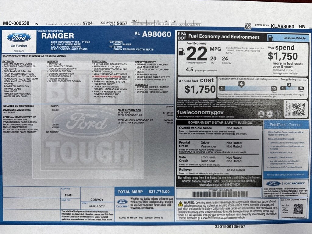 2019 Ford Ranger XLT Ingot Silver 4WD EcoBoost 2.3L I4 GTDi DOHC Turbocharged VCT