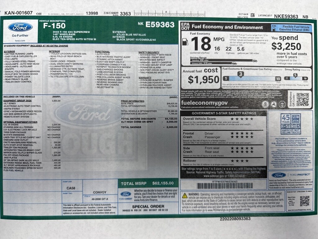 Extra Clean!, F-150 XLT, 4D SuperCrew, 5.0L V8, 10-Speed Automatic, 4WD, Atlas Blue Metallic, Black Cloth, 10-Way Power Driver & Passenger Seats, 2-Bar Style Grille w/Chrome 2 Minor Bars, 4x4 FX4 Off-Road Bodyside Decal, 8" Productivity Screen in Instrument Cluster, Accent-Color Step Bars, Auto-Dimming Rear-View Mirror, Black 2-Bar Style Grille w/Black Surround/Accents, Body-Color Door & Tailgate Handles, Body-Color Front & Rear Bumpers, Box Side Decals, Bright Polished Step Bars, Chrome Door & Tailgate Handles w/Body-Color Bezel, Chrome Single-Tip Exhaust, Class IV Trailer Hitch Receiver, Dual Zone Electronic Automatic Temperature Control, Equipment Group 302A High, FX4 Off-Road Package, Heated Front Seats, Hill Descent Control, Integrated Trailer Brake Controller, Intelligent Access w/Push Button Start, Leather-Wrapped Steering Wheel, LED Reflector Headlamps, LED Sideview Mirror Spotlights, Monotube Rear Shocks, Off-Road Tuned Front Shock Absorbers, Onboard 400W Outlet, Power Glass Heated Sideview Mirrors, Pro Trailer Backup Assist, Radio: AM/FM SiriusXM w/360L, Rear Under-Seat Storage, Remote Start System w/Remote Tailgate Release, Rock Crawl Mode, SecuriCode Drivers Side Keyless-Entry Keypad, SYNC 4 w/Enhanced Voice Recognition, Trailer Tow Package, Tray Style Floor Liner (47W), Unique Sport Cloth 40/Console/40 Front-Seats, Wheels: 18" 6-Spoke Machined Aluminum, Wheels: 18" Chrome-Like PVD, XLT Chrome Appearance Package, XLT Sport Appearance Package, Zone Lighting.