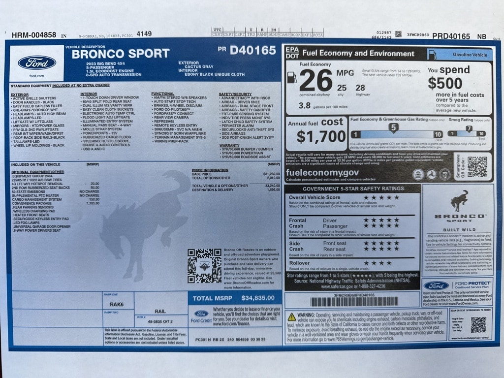 Extra Clean!, Local Trade, Bronco Sport Big Bend, 4D Sport Utility, 1.5L EcoBoost, 8-Speed Automatic, 4WD, Cactus Gray, Ebony Cloth, Convenience Package, Equipment Group 200A, Front Driver & Passenger Seatback Zipper Pockets, Heated Front Bucket Seats, Intelligent Access (Lock/Unlock), Leather-Wrapped Steering Wheel, LED Fog Lamps, Rear Parking Sensors, Universal Garage Door Opener (UGDO), Wireless Charging Pad.
