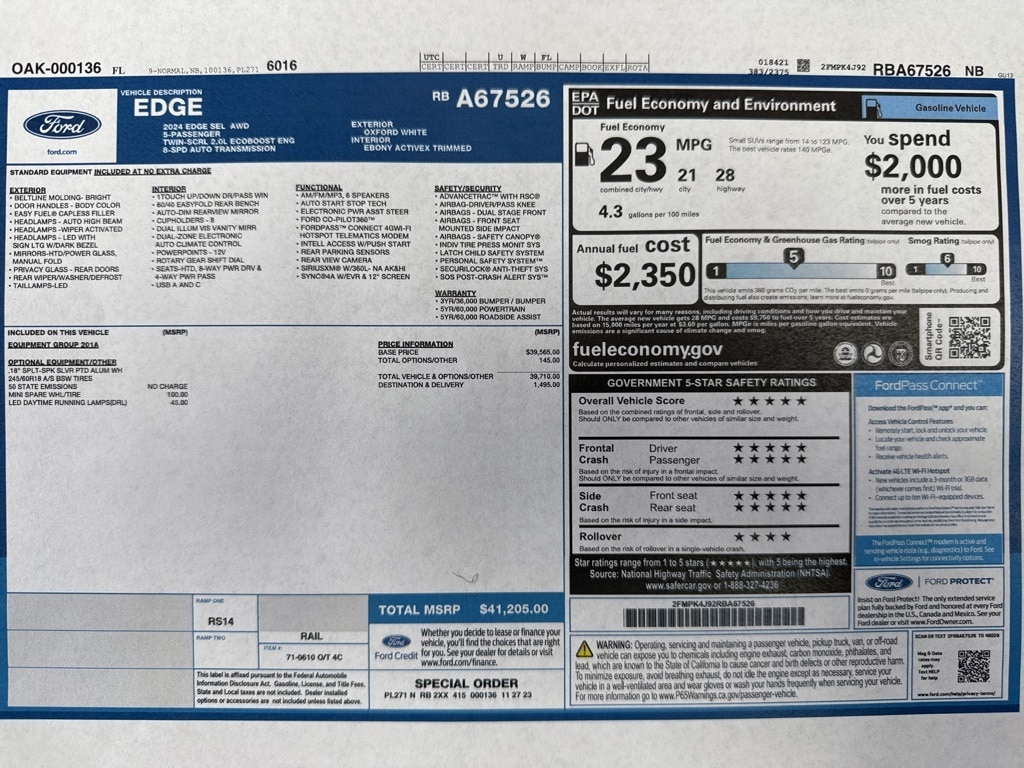 2024 Ford Edge SEL Oxford White AWD EcoBoost 2.0L I4 GTDi DOHC Turbocharged VCT