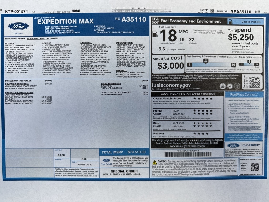 Extra Clean!, One Owner!, Expedition Max Limited, 4D Sport Utility, EcoBoost 3.5L V6 GTDi DOHC 24V Twin Turbocharged, 10-Speed Automatic, 4WD, Oxford White, Mahogany Leather, Ebony Black Mesh Grille, Equipment Group 302A High Package, Heavy-Duty Independent Suspension, Magnetic-Painted Power Deployable Running Boards, Navigation system: Connected Navigation, Power moonroof, Power-Folding Sideview Mirrors w/Autofold, Wheels: 22" 12-Spoke Polished Aluminum.