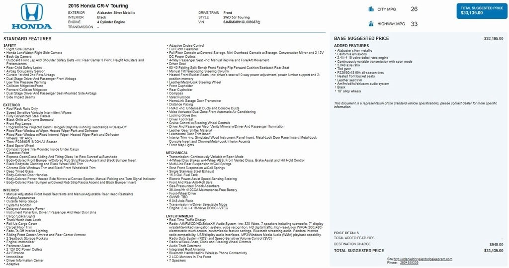 Local Trade in, CR-V Touring, 18" Alloy Wheels, Exterior Parking Camera Rear, Heated front seats, Lane Departure Warning System, Leather Seat Trim, Memory seat, Navigation System, Power driver seat, Power Liftgate, Power moonroof.
