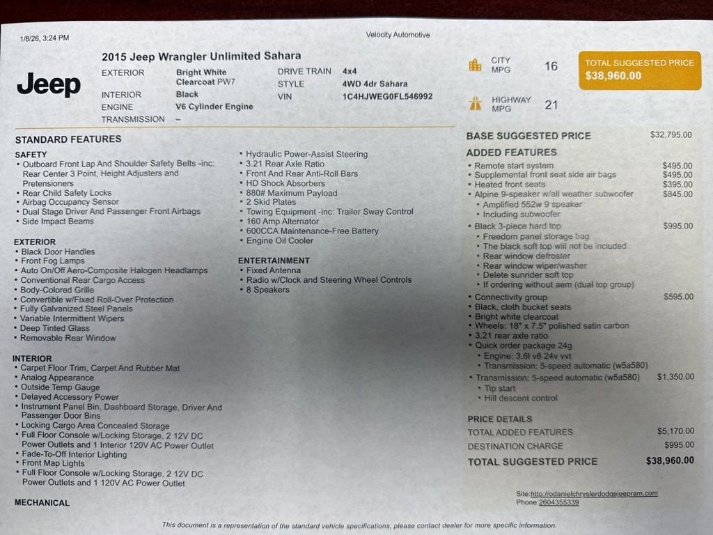 Extra Clean!, Local Trade, Wrangler Unlimited Sahara, 4D Sport Utility, 3.6L V6 24V VVT, 5-Speed Automatic, 4WD, Bright White Clearcoat, Black Cloth, Connectivity Group, Quick Order Package 24G, Tire Pressure Monitoring Display, Vehicle Information Center.