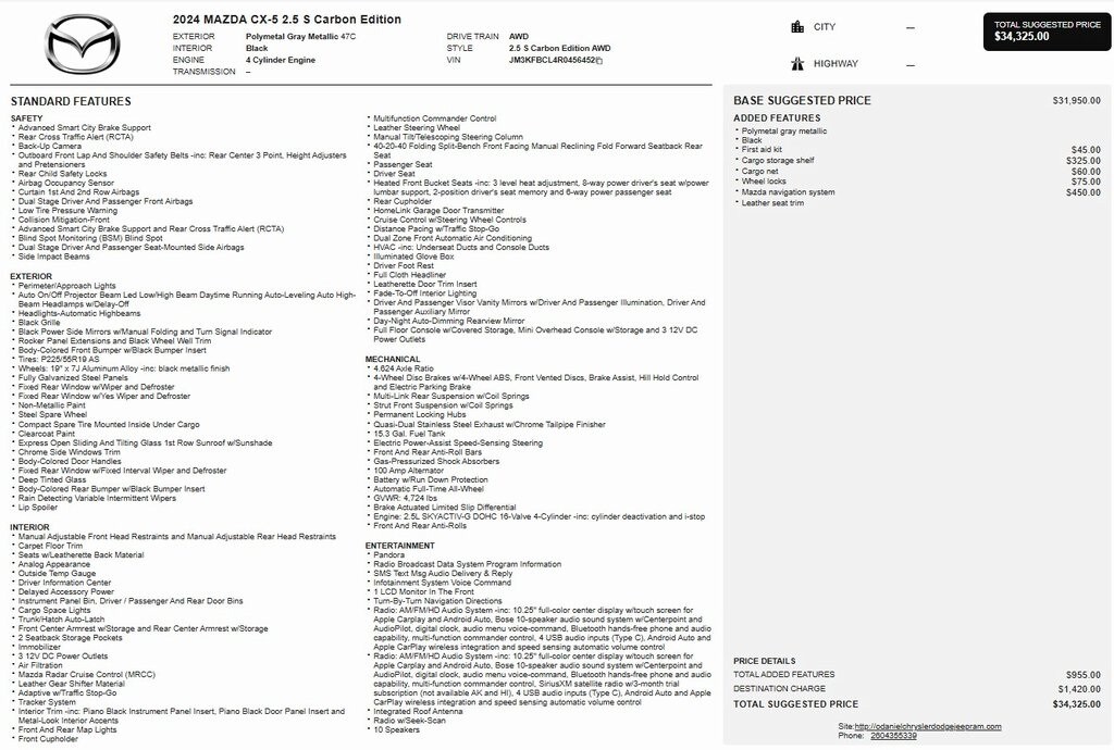 1 Owner, Certified Pre Owned, CX-5 2.5 S Carbon Edition, AWD, AppLink/Apple CarPlay and Android Auto, Auto High-beam Headlights, Exterior Parking Camera Rear, Heated front seats, Leather Seat Trim, Memory seat, Power driver seat, Power Liftgate, Power moonroof, Rain sensing wipers, Wheels: 19" x 7J Aluminum Alloy.