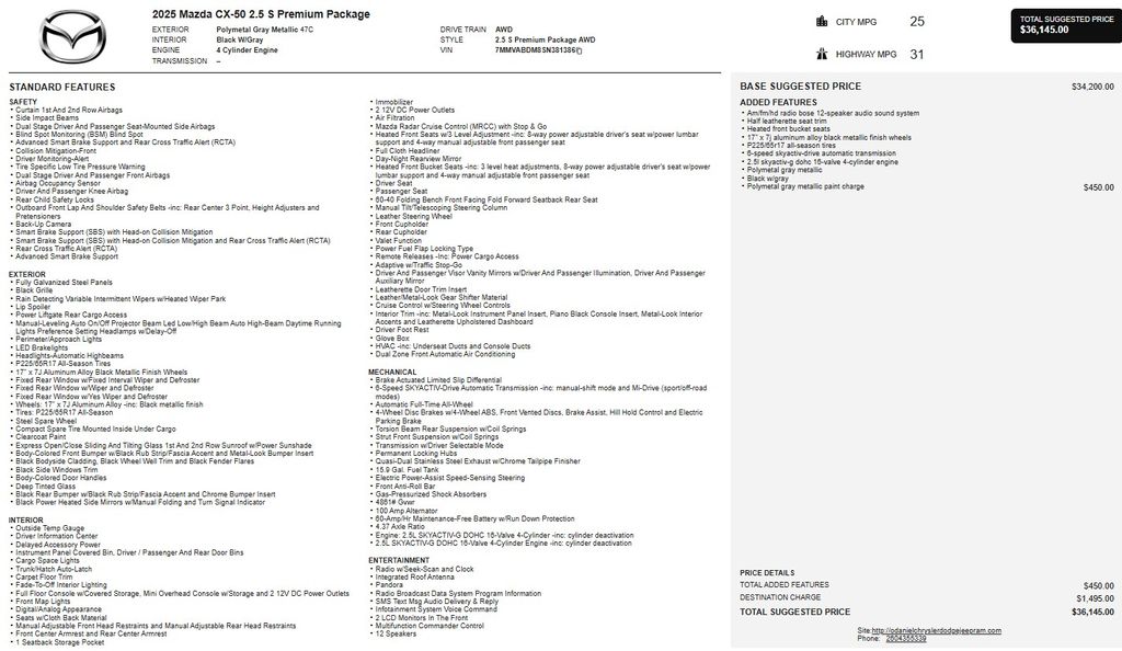 This Certified Pre-Owned CX-50 has been meticulously inspected and comes with the peace of mind of a comprehensive warranty, ensuring you can enjoy worry-free ownership. With its exceptional value, impressive capabilities, and refined design, this 2025 Mazda CX-50 2.5 S Premium Package is the perfect choice for the discerning SUV buyer.