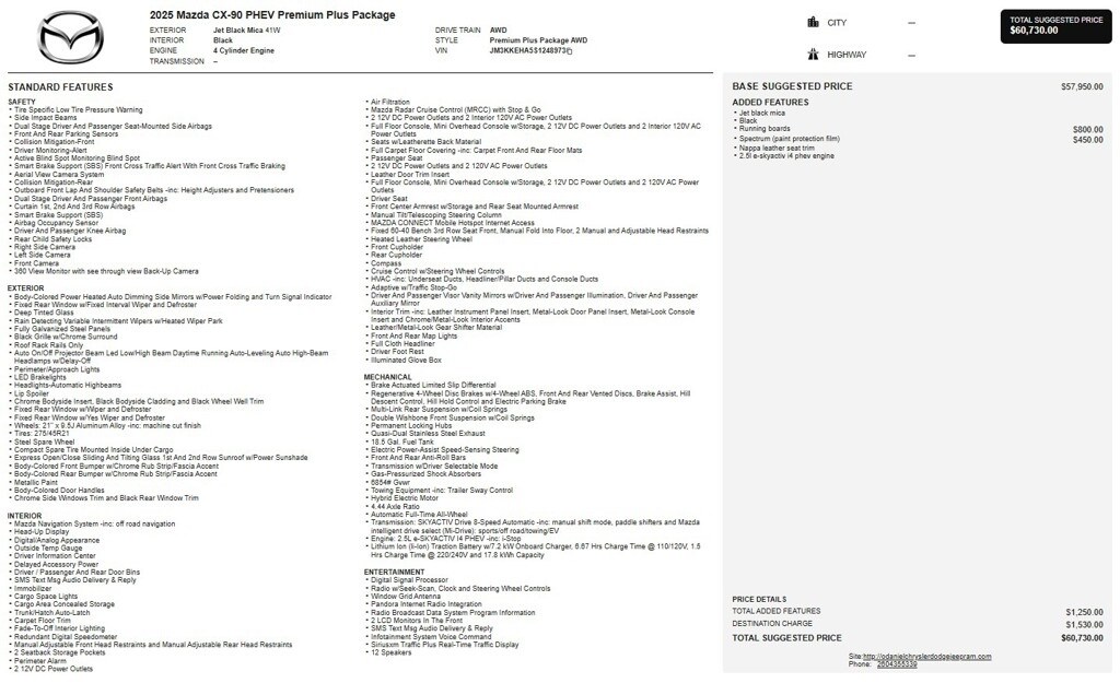 Apple CarPlay / Android Auto, 1 Owner, Certified Pre Owned, Executive Vehicle, CX-90 PHEV Premium Plus, AWD, Auto High-beam Headlights, Heads-Up Display, Heated rear seats, Heated steering wheel, Heated/Ventilated Front Bucket Seats, Mazda Navigation System, Memory seat, Nappa Leather Seat Trim, Navigation system: MAZDA CONNECT, Power driver seat, Power Liftgate, Power moonroof, Rain sensing wipers, Wheels: 21" x 9.5J Aluminum Alloy.