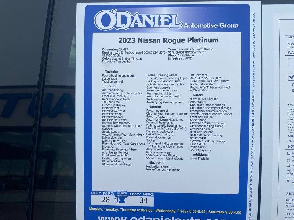Priced below KBB Fair Purchase Price! Local Trade in, Rogue Platinum, AWD, 19" Aluminum Alloy Wheels, Auto High-beam Headlights, Heads-Up Display, Heated front seats, Heated steering wheel, Memory seat, Navigation system: NissanConnect Navigation, NissanConnect featuring Apple CarPlay and Android Auto, Platinum Premium Package, Power driver seat, Power Liftgate, Power moonroof, Quilted Semi-Aniline Leather Seat Trim, Rear Heated Seats, Speed-Sensitive Wipers, Tri-Zone HVAC.