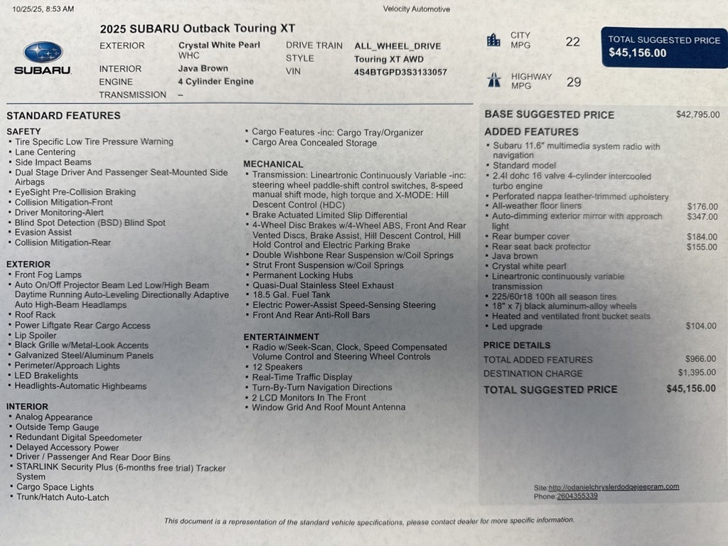 2025 Subaru Outback Touring XT Crystal White Pearl AWD 2.4L DOHC