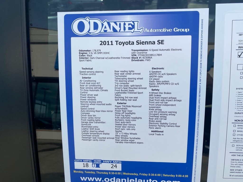 Local Trade in, Sienna SE, 3.5L V6 SMPI DOHC, 19" x 7J Alloy Wheels, Leatherette-Trimmed Sport Fabric, Power driver seat, Power Rear Door, Power Tilt/Slide Moonroof w/Sunshade, Radio: AM/FM/MP3 CD w/6 Speakers, Rear Window Sunshades, Roof Rails, SE Preferred Package, Towing Package (3,500lbs), Tri Zone Automatic Climate Control.